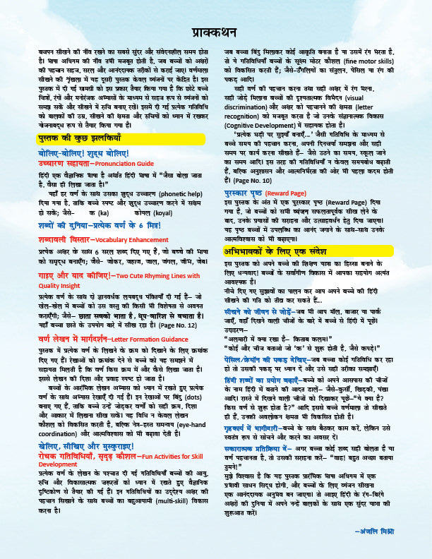 • Introduces Hindi sounds, letters (स्वर and व्यंजन), and words in a structured way. • Helps children develop early reading and writing readiness. • Fun, engaging activities and colourful visuals make learning Hindi enjoyable. • Reduces the fear of language learning at an early stage. • Picture-word association and simple texts help children understand meaning. • Builds the foundation for sentence reading in later grades. • Gradual progression helps children feel successful and motivated.