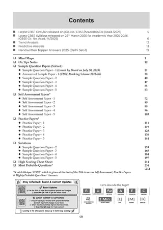 BENEFITS OF THIS SERIESA. 15 Full-Length Papers with Latest CBSE Blueprinto Strictly aligned with 2025 – 26 Board Sample Paper design & Syllabus.B. 50% Competency Focused Based + 20% HEQs (Highly Expected Questions)o Includes predicted, exam-relevant original questions tagged as HEQ.C. Smart Tags for Every Questiono Difficulty Level • Time to Solve • Bloom’s Level.D. Fully Solved with Marking Scheme ; Answering Tipso Value points, Commonly Made Errors & Answering Tips, and 20% Topper’s answers included.E. 5 Most Likely Practice Papers like the Real Examo Papers mimic actual board exam pattern with instructions, timing, and difficulty levels—exact CBSEblueprint followed.F. On Tips Notes + Smart QR Integrationo Quick glimpse at each concept for revisiono Scan for Fast Revision Notes for all ChaptersG. "Why This Answer?"; Explanations for MCQso Detailed logic for correct options and also for incorrect answers helps build concept clarity and avoid sillymistakes.H. Why are Most Probable Questions from each Chapter ?o Chapter-wise Most Probable Questions designed for a quick recap after full preparation — helping youboost confidence and ensure 100% exam readiness