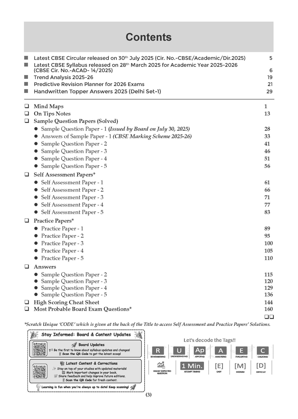 BENEFITS OF THIS SERIESA. 15 Full-Length Papers with Latest CBSE Blueprinto Strictly aligned with 2025 – 26 Board Sample Paper design & Syllabus.B. 50% Competency Focused Based + 40% HEQs (Highly Expected Questions)o Includes predicted, exam-relevant original questions tagged as HEQ.C. Smart Tags for Every Questiono Difficulty Level • Time to Solve • Bloom’s Level.D. Fully Solved with Marking Scheme & Answering Tipso Value points, Commonly Made Errors & Answering Tips, and 20% Topper’s answers included.E. 5 Most Likely Practice Papers like the Real Examo Papers mimic actual board exam pattern with instructions, timing, and difficulty levels—exact CBSEblueprint followed.F. On Tips Notes + Smart QR Integrationo Quick glimpse at each concept for revisiono Scan for Fast Revision Notes for all ChaptersG. "Why This Answer?"; Explanations for MCQso Detailed logic for correct options and also for incorrect answers helps build concept clarity and avoid sillymistakes.H. Why are Most Probable Questions from each Chapter ?o Chapter-wise Most Probable Questions designed for a quick recap after full preparation — helping youboost confidence and ensure 100% exam readiness
