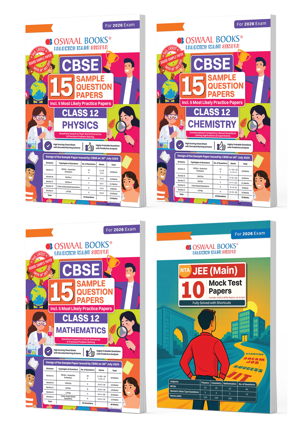 CBSE Class 12th 15 Sample Question Papers PCM + JEE Main 10 Mock Test Papers | 2500+ Qs, HEQs, PYQs, Mind Maps, Shortcuts, Trend Analysis, Tips & Fast Revision Notes, Most Probable Qs (Set of 4, For 2026 Exams)