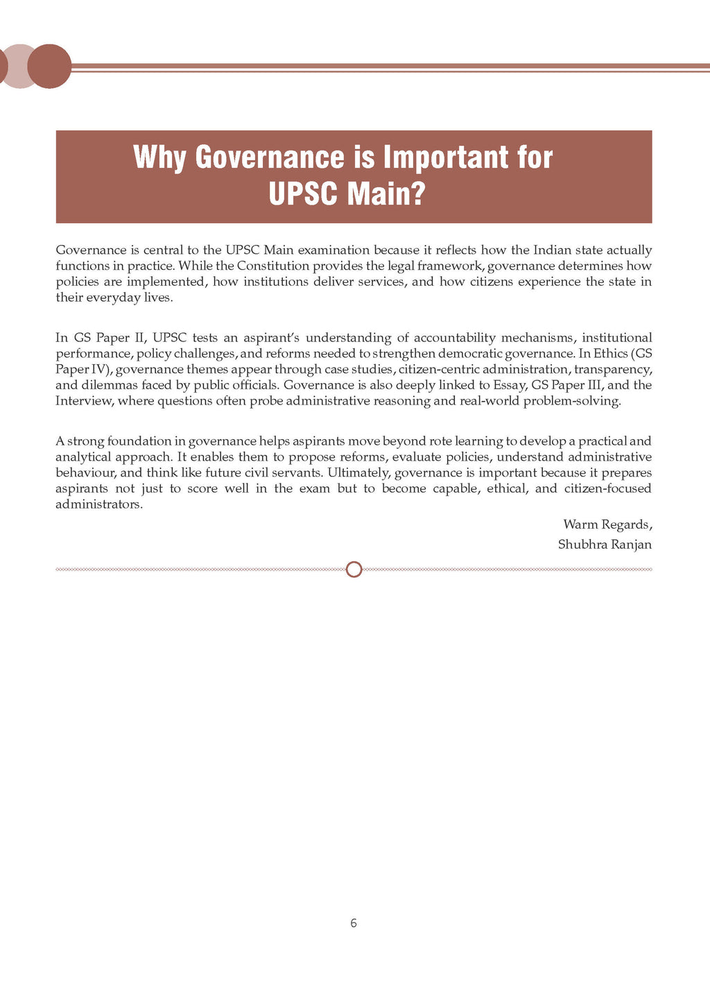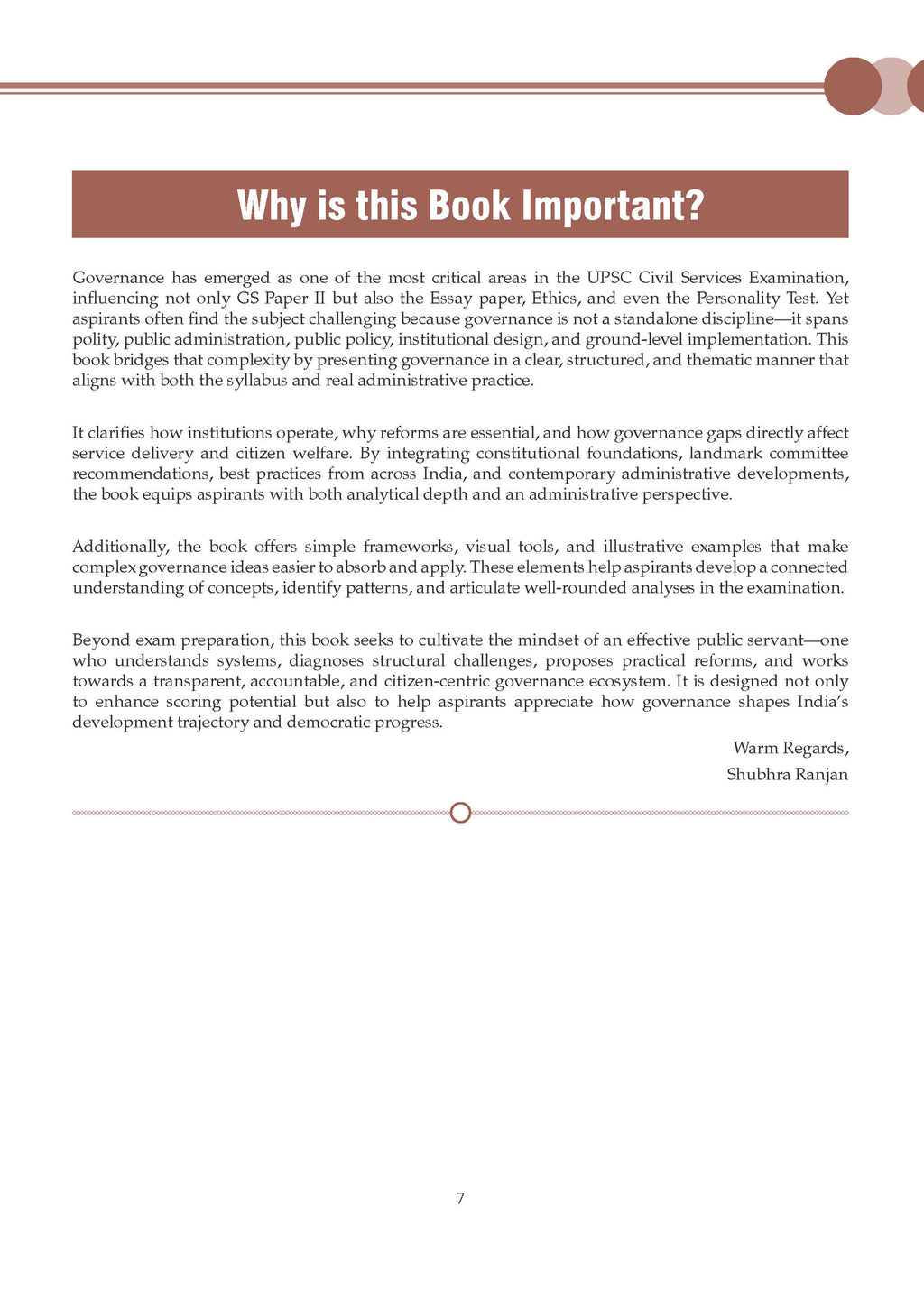 Benefits of the book which distinguish it from others:• Exam-Ready Content: Covers PYQs (2013–2025) and aligns perfectly with the UPSC syllabus for targeted preparation.• Conceptual Clarity: Simplifies complex topics through 2nd ARC & NITI Aayog–based explanations.• Real-Life Insights: Includes contemporary case studies from Indian administration to enrich your answers.• Visual Learning: Diagrams and models for faster recall and better conceptual understanding.• Mains Mastery: Provides model answers and value additions to help you write high-quality, exam-oriented responses.