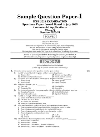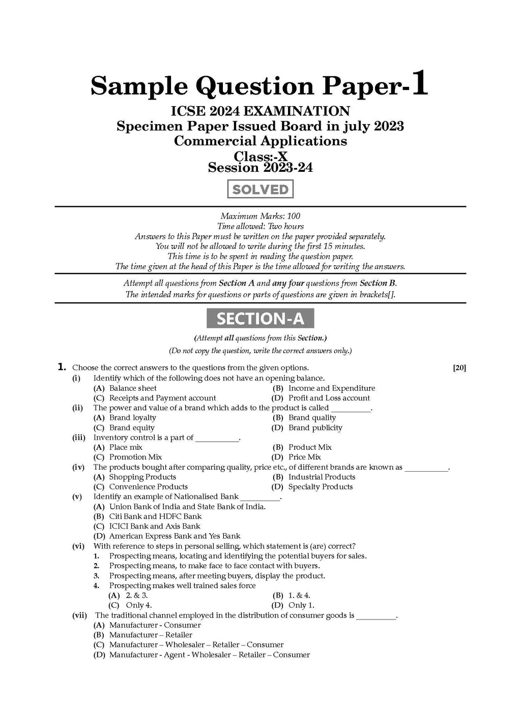 ICSE 10 Sample Question Papers Class 10 Commercial Applications For Board Exam 2024 (Based On The Latest CISCE/ ICSE Specimen Paper)
