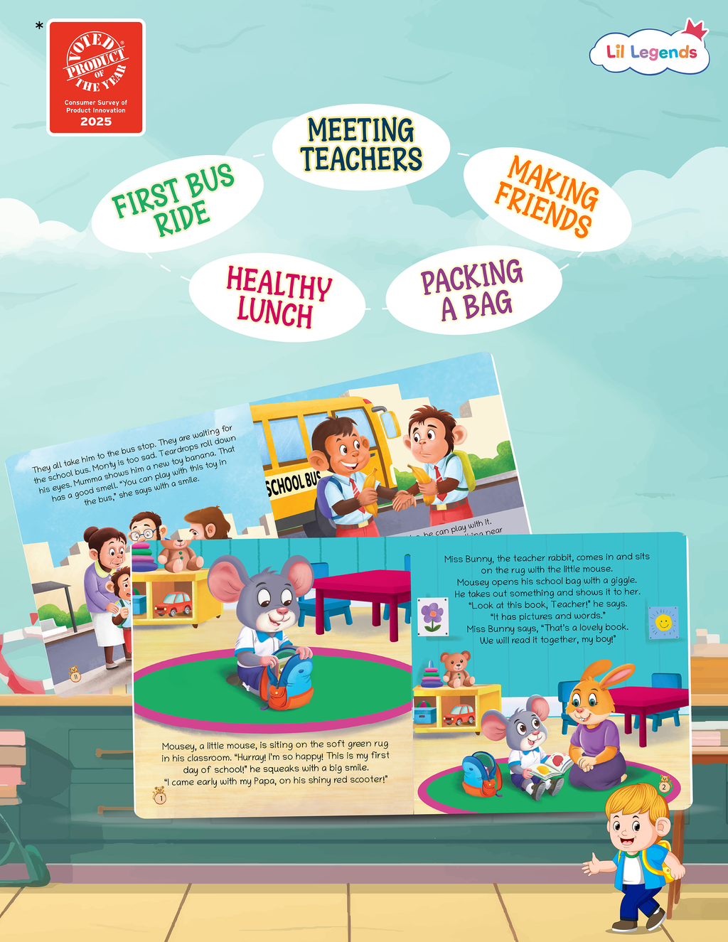 The Lil Legends School Readiness Series is a beautifully crafted slipcase of five picture books that gently introduce toddlers and preschoolers to the world of school. Each story reflects real experiences a young child encounters — from discovering what goes inside their bag to greeting teachers, riding the school bus and enjoying lunchtime.