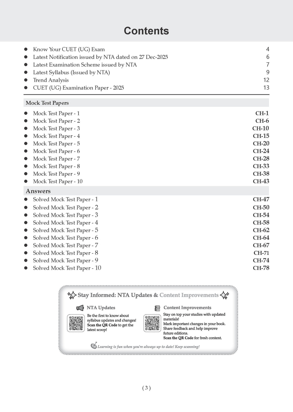 10 Full-Length CUET UG Mock Test Papers: Carefully designed CUET UG mock tests aligned with the latest NTA guidelines (as per the latest 27 Dec., notification) to simulate the real CUET exam. 250-500+ NCERT-Based MCQs for CUET UG: Extensive practice with CUET UG MCQs covering all question typologies, including case-based and passage-based questions, with detailed solutions. AI-Powered Smart Practice Support: AI-enabled personalised practice to identify weak areas, strengthen concepts, and improve accuracy—ideal for focused CUET UG exam preparation. NCERT-Perfect, Competency-Based Content: Questions are strictly mapped to the NCERT syllabus, ensuring relevance for all CUET UG domain subjects under the competency-based assessment framework. CUET Exam Trend Analysis (2023–2025): In-depth analysis of recent CUET UG exam trends to help students prioritise high-weightage topics and frequently asked question types.