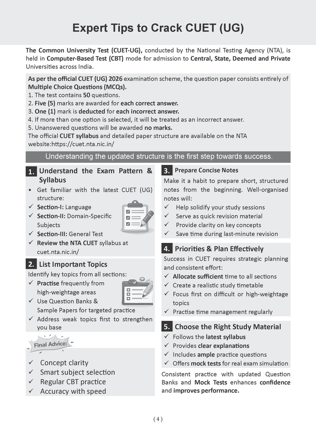 • Real CUET Exam Simulation: Experience the structure, difficulty level, and time pressure of the actual exam through authentic CUET UG mock tests.• Performance Tracking & Preparation Analysis: Evaluate your readiness after every test and track improvement across multiple CUET mock test papers.• Identify Strengths and Weak Areas: Pinpoint exactly what to revise with data-driven insights—making this an effective CUET UG practice book.• Strategic Exam Readiness: Improve speed, accuracy, and smart question selection—key skills for scoring high in the CUET UG exam.• Learn from Every CUET Mock Test: Detailed answer keys and step-by-step explanations help analyse mistakes and avoid repetition.• Confidence for CUET Exam Day: Regular practice with full-length CUET UG sample (Mock Test) papers reduces exam anxiety and builds confidence to perform at your best.