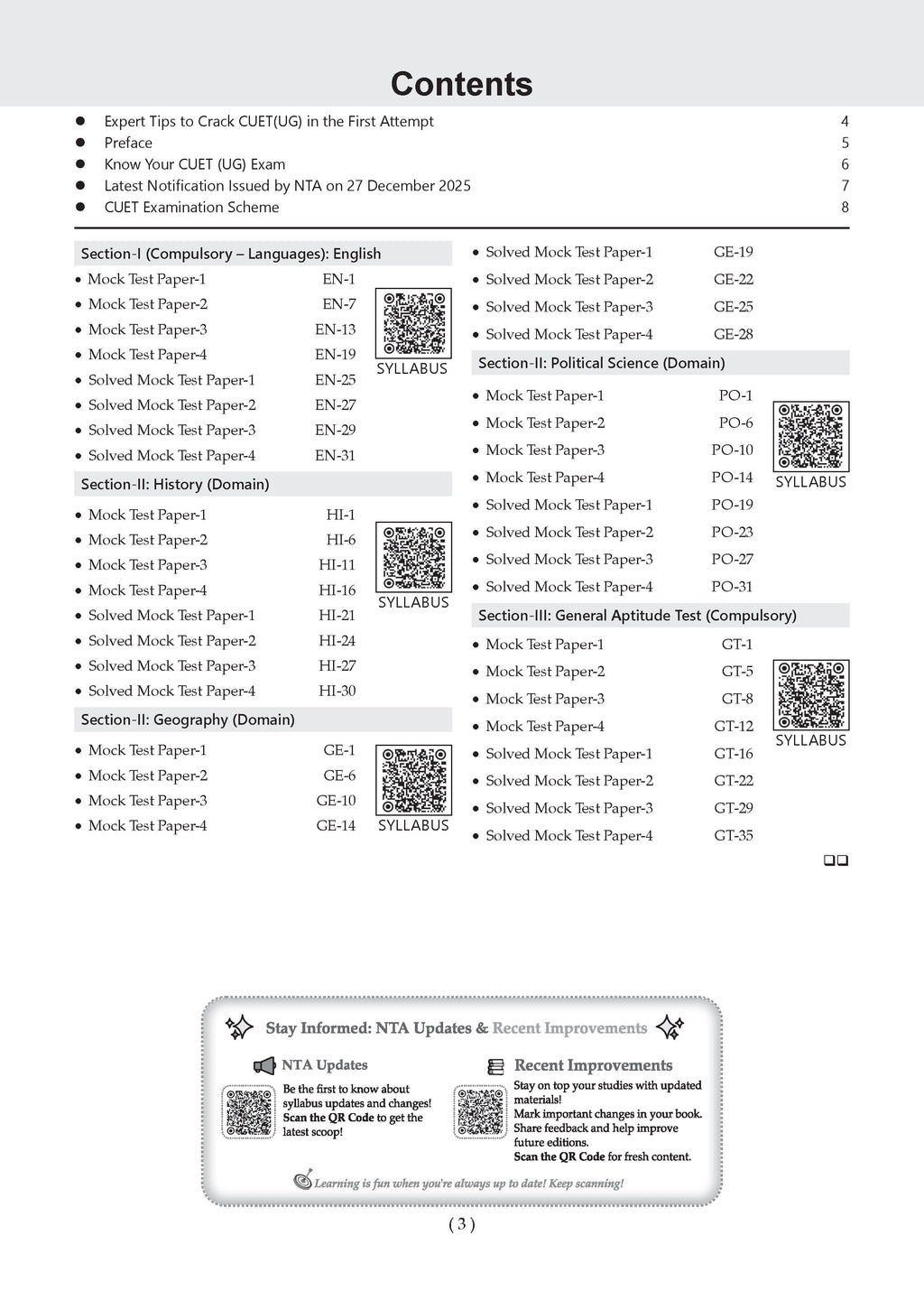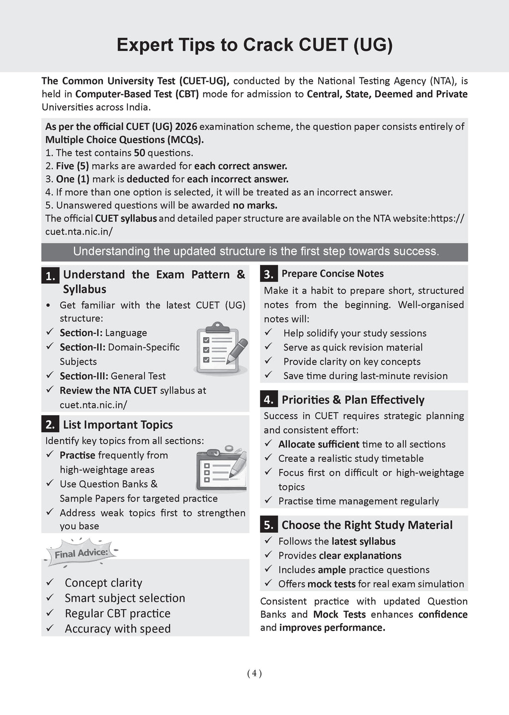 • Real CUET Exam Simulation: Experience the structure, difficulty level, and time pressure of the actual exam through authentic CUET UG mock tests.• Performance Tracking & Preparation Analysis: Evaluate your readiness after every test and track improvement across multiple CUET mock test papers.• Identify Strengths and Weak Areas: Pinpoint exactly what to revise with data-driven insights—making this an effective CUET UG practice book.• Strategic Exam Readiness: Improve speed, accuracy, and smart question selection—key skills for scoring high in the CUET UG exam.• Learn from Every CUET Mock Test: Detailed answer keys and step-by-step explanations help analyse mistakes and avoid repetition.• Confidence for CUET Exam Day: Regular practice with full-length CUET UG sample (Mock Test) papers reduces exam anxiety and builds confidence to perform at your best.