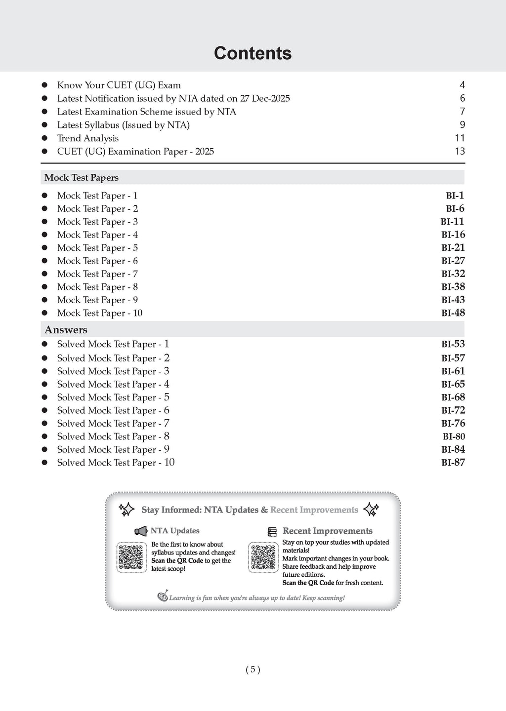 10 Full-Length CUET UG Mock Test Papers: Carefully designed CUET UG mock tests aligned with the latest NTA guidelines (as per the latest 27 Dec., notification) to simulate the real CUET exam. 250-500+ NCERT-Based MCQs for CUET UG: Extensive practice with CUET UG MCQs covering all question typologies, including case-based and passage-based questions, with detailed solutions. AI-Powered Smart Practice Support: AI-enabled personalised practice to identify weak areas, strengthen concepts, and improve accuracy—ideal for focused CUET UG exam preparation. NCERT-Perfect, Competency-Based Content: Questions are strictly mapped to the NCERT syllabus, ensuring relevance for all CUET UG domain subjects under the competency-based assessment framework. CUET Exam Trend Analysis (2023–2025): In-depth analysis of recent CUET UG exam trends to help students prioritise high-weightage topics and frequently asked question types.