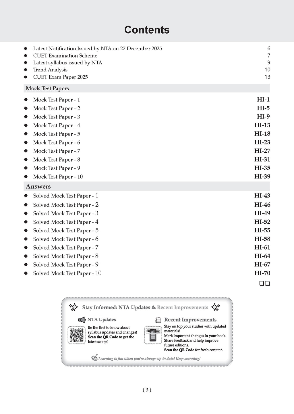 10 Full-Length CUET UG Mock Test Papers: Carefully designed CUET UG mock tests aligned with the latest NTA guidelines (as per the latest 27 Dec., notification) to simulate the real CUET exam. 250-500+ NCERT-Based MCQs for CUET UG: Extensive practice with CUET UG MCQs covering all question typologies, including case-based and passage-based questions, with detailed solutions. AI-Powered Smart Practice Support: AI-enabled personalised practice to identify weak areas, strengthen concepts, and improve accuracy—ideal for focused CUET UG exam preparation. NCERT-Perfect, Competency-Based Content: Questions are strictly mapped to the NCERT syllabus, ensuring relevance for all CUET UG domain subjects under the competency-based assessment framework. CUET Exam Trend Analysis (2023–2025): In-depth analysis of recent CUET UG exam trends to help students prioritise high-weightage topics and frequently asked question types.