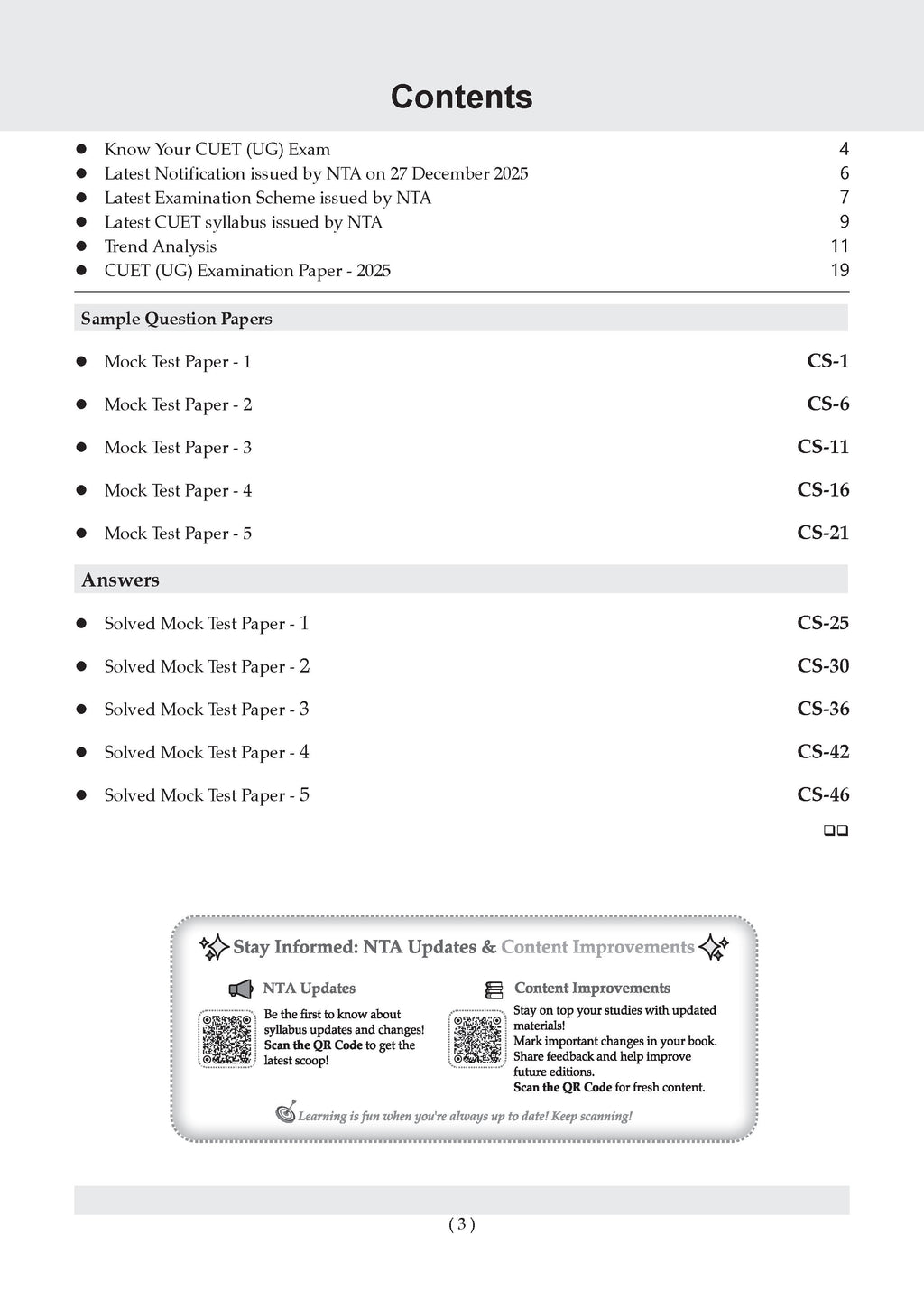 10 Full-Length CUET UG Mock Test Papers: Carefully designed CUET UG mock tests aligned with the latest NTA guidelines (as per the latest 27 Dec., notification) to simulate the real CUET exam. 250-500+ NCERT-Based MCQs for CUET UG: Extensive practice with CUET UG MCQs covering all question typologies, including case-based and passage-based questions, with detailed solutions. AI-Powered Smart Practice Support: AI-enabled personalised practice to identify weak areas, strengthen concepts, and improve accuracy—ideal for focused CUET UG exam preparation. NCERT-Perfect, Competency-Based Content: Questions are strictly mapped to the NCERT syllabus, ensuring relevance for all CUET UG domain subjects under the competency-based assessment framework. CUET Exam Trend Analysis (2023–2025): In-depth analysis of recent CUET UG exam trends to help students prioritise high-weightage topics and frequently asked question types.