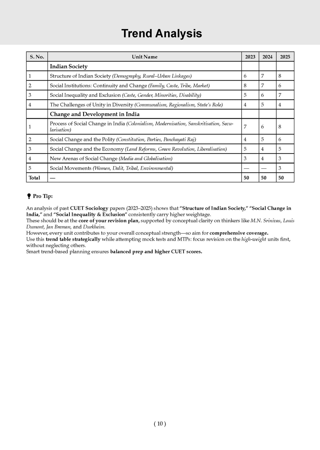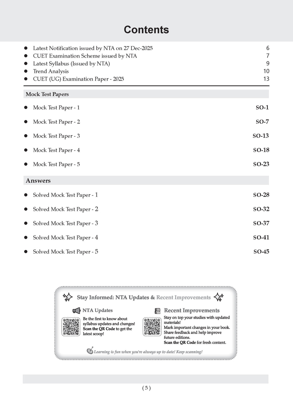 10 Full-Length CUET UG Mock Test Papers: Carefully designed CUET UG mock tests aligned with the latest NTA guidelines (as per the latest 27 Dec., notification) to simulate the real CUET exam. 250-500+ NCERT-Based MCQs for CUET UG: Extensive practice with CUET UG MCQs covering all question typologies, including case-based and passage-based questions, with detailed solutions. AI-Powered Smart Practice Support: AI-enabled personalised practice to identify weak areas, strengthen concepts, and improve accuracy—ideal for focused CUET UG exam preparation. NCERT-Perfect, Competency-Based Content: Questions are strictly mapped to the NCERT syllabus, ensuring relevance for all CUET UG domain subjects under the competency-based assessment framework. CUET Exam Trend Analysis (2023–2025): In-depth analysis of recent CUET UG exam trends to help students prioritise high-weightage topics and frequently asked question types.